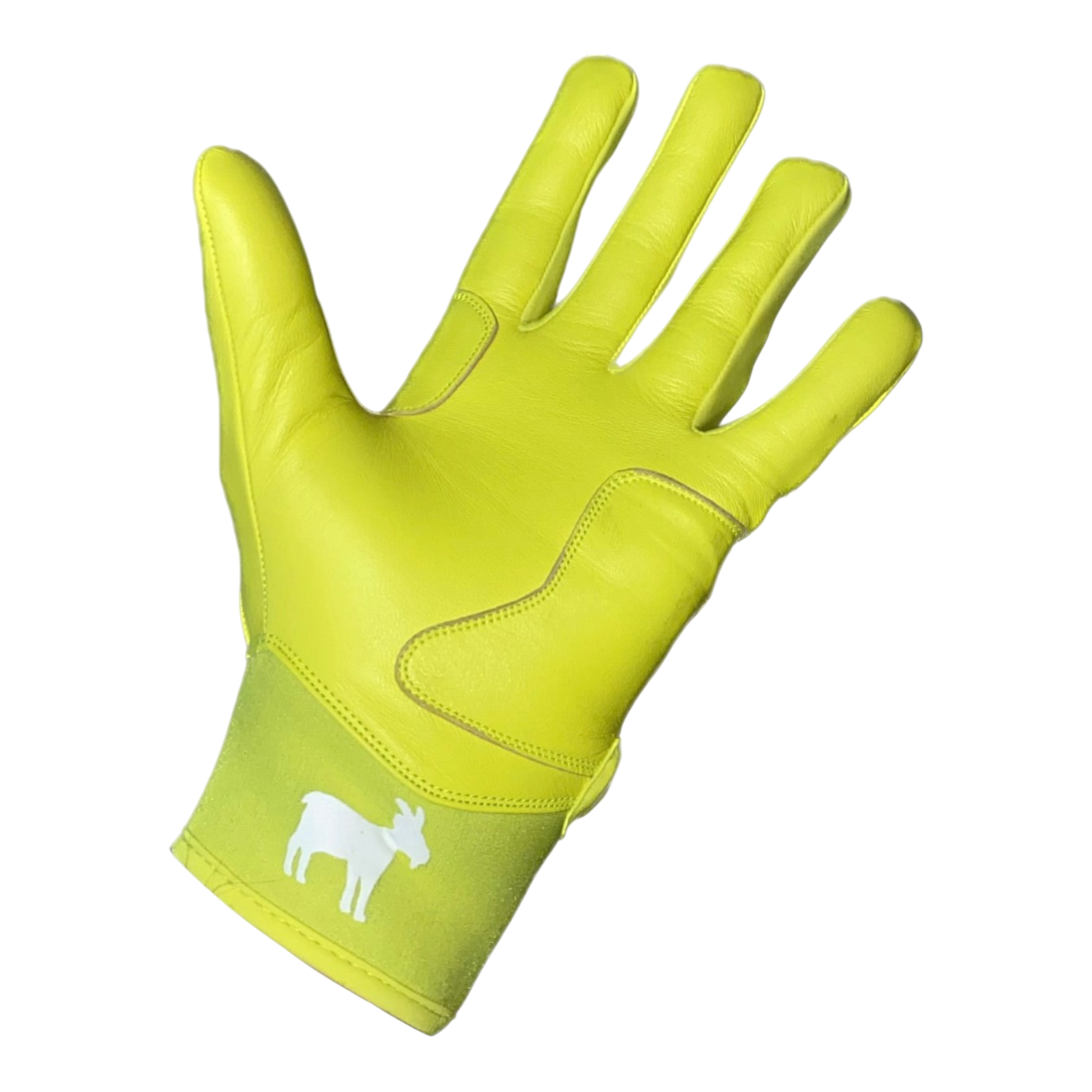 Made of Cabretta leather, these batting gloves are built for comfort and durability! In an neon yellow color way with white accents, these gloves will keep you looking sweet on the field all season long! These gloves come with a single wrist cuff that features our GOAT logo on the wrist!